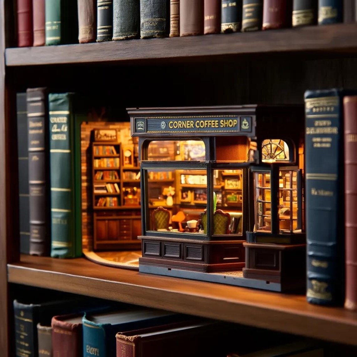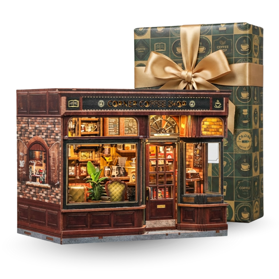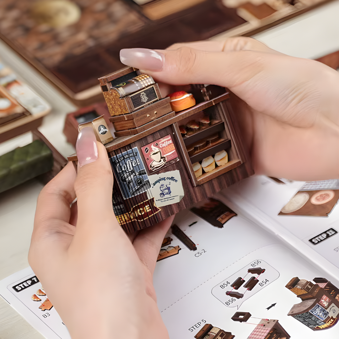 Build a tiny COFFEE SHOP scene with simple step-by-step instructions. The 294 pieces snap together easily, making it a fun 8 hour project — and a perfect gift for book lovers or creative minds.